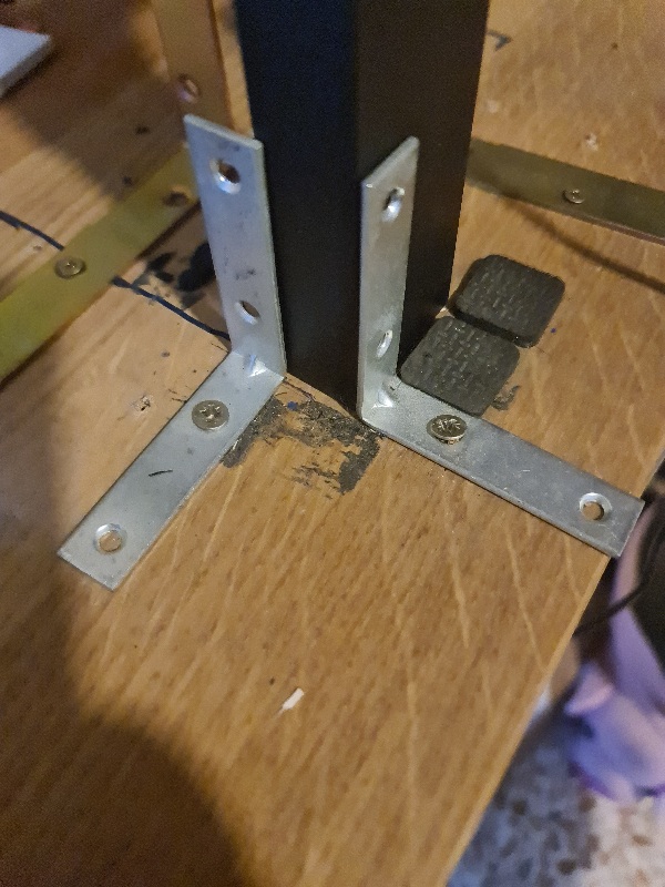 le L metalliche a 90° della misura minima di 6.5 cm e fissarle al tavolo (povero tavolo lo riempiremo di buchi) per bloccare la posizione del piedi del laser come in figura la stessa cosa va fatta per gli altri piedi del laser cosi avrete un piano fisso.